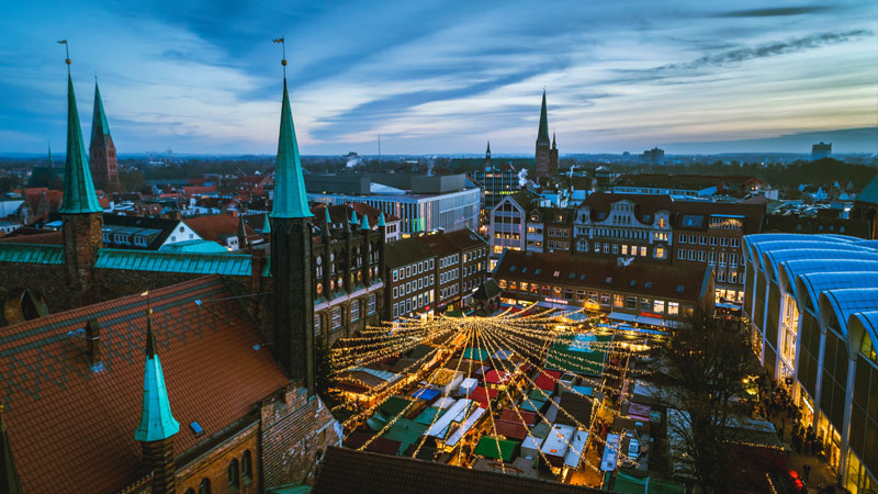 Julmarknaden i Lübeck är vida känd och lockar tusentals besökare varje år. Runt Rådhuset hittar vi en av härlig julmarknad. Under ett besök i staden får man heller inte missa att titta in i Niedereggers marsipanbutik.